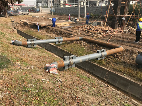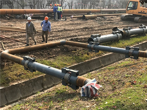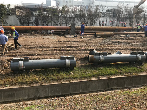 2017-11月上海金山化工區污水管道補償器安裝現場: 現場工人忙碌的身影 初步補償器管道正在連接中 現場工人們正安裝屬于中等不銹鋼波紋管補償管道 上海漢麥金屬軟管制造有限公司
